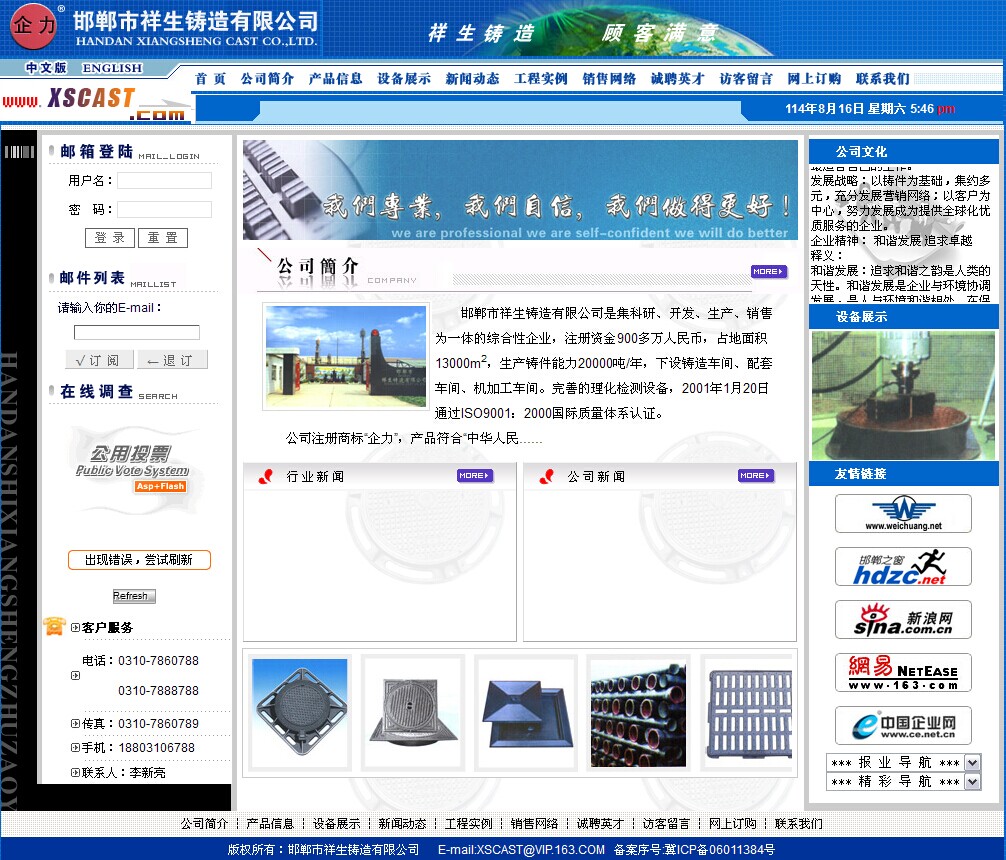 Copyright © 2014 邯鄲市祥生鑄造有限責任公司 All Rights Reserved. 冀ICP備15028350號-1 站點地圖 技術支持:網加思維 地 址:河北省邯鄲市臨漳縣朱明大街北段路西 電 話 :0310-7860788 7888788 郵 箱:xscast@163.com